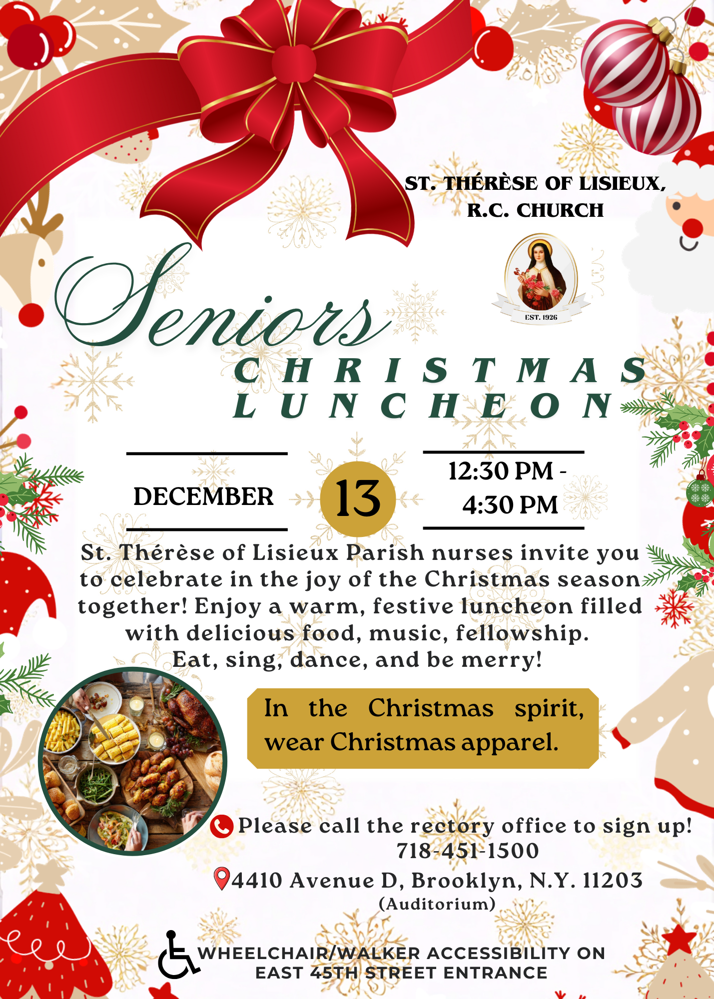 St. Therese of Lisieux Church 209 Bennett Ave, Staten Island, NY, United StatesSt. Therese of Lisieux Parish Nurses invites you to celebrate in the joy of the Christmas season together! Enjoy a warm, festive luncheon filled with delicious food, music, fellowship. Eat, […]
