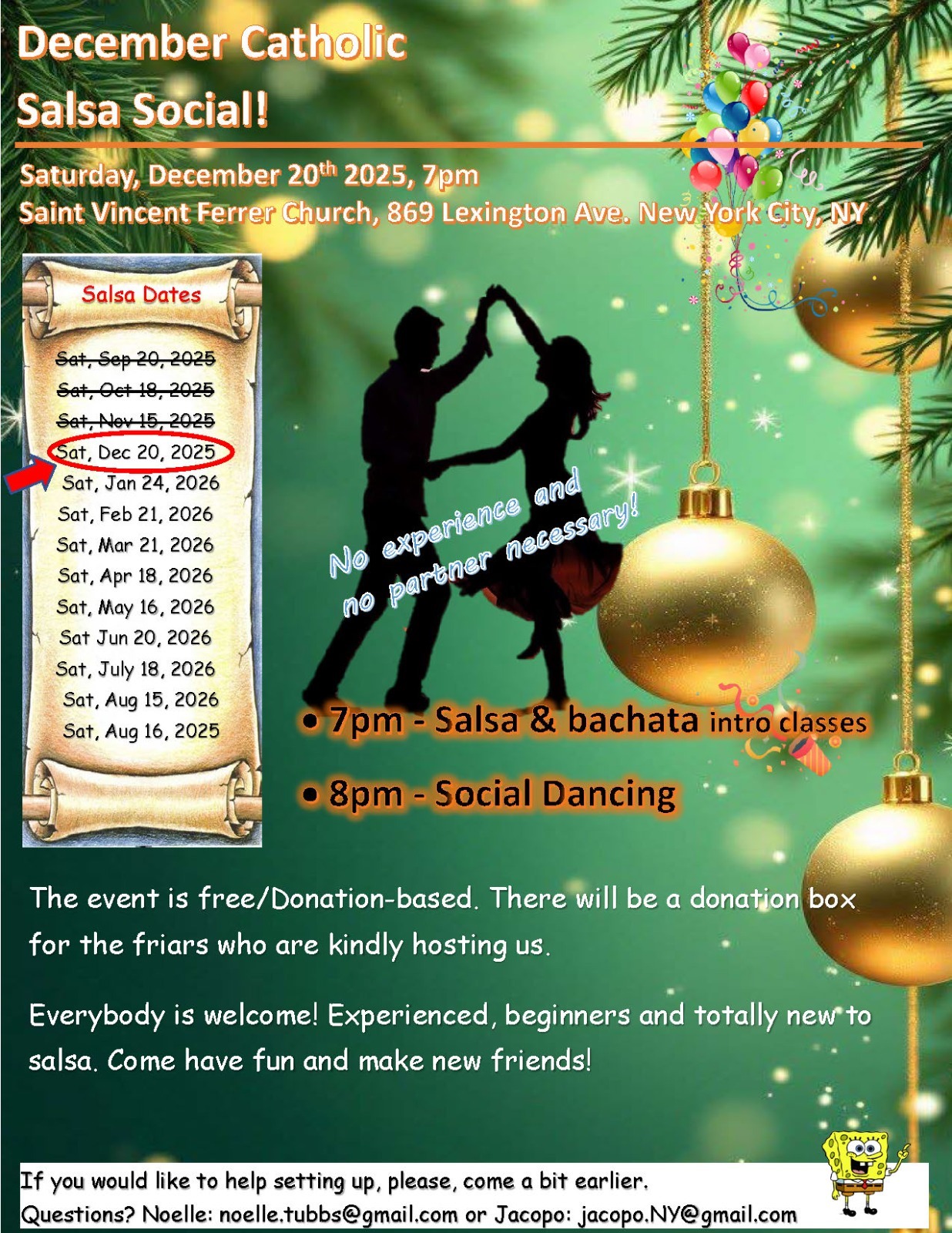 Salsa Social is an opportunity for fellowship and dancing at Saint Vincent Ferrer church on Saturday, December 20 beginning at 7:00pm. There will be salsa and bachata introductory classes and social dancing to follow. (the salsa class will be “on2”).